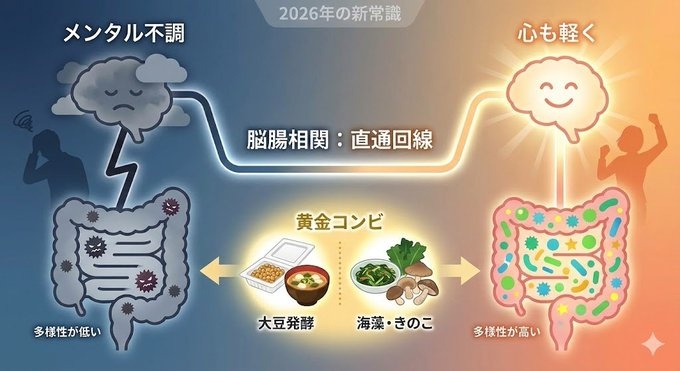 薬に頼る前に、まずはスーパーで買えるこの組み合わせを試してほしいです。腸と脳は直通回線で繋がってるから、お腹が整うと勝手に心も軽くなります!