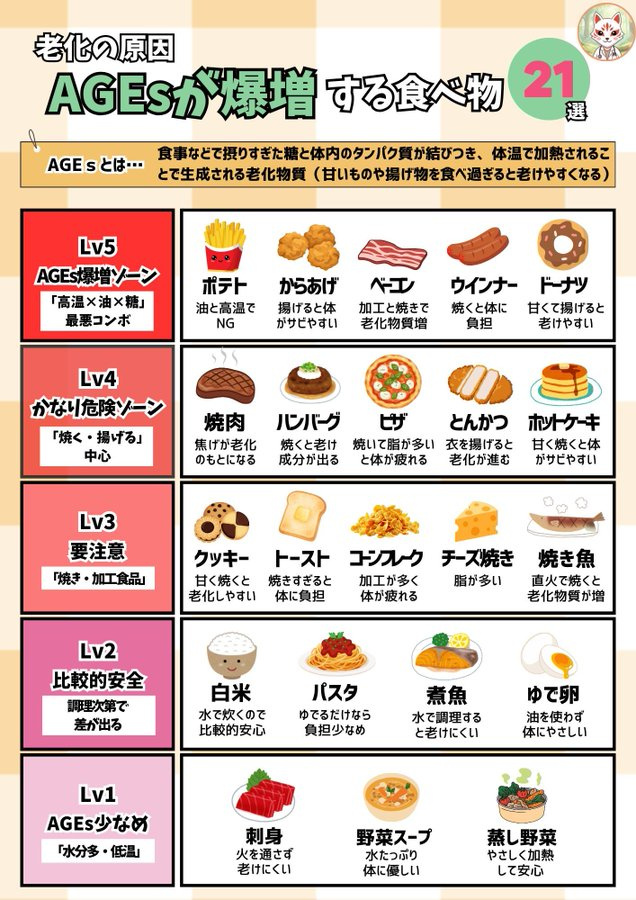 老けたくない人は 食材より先に調理法を変えてる AGEsを溜めたくない人向けに表まとめたよ↓