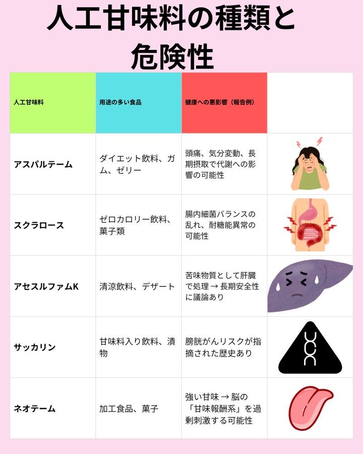 アスパルテーム → 頭痛や気分変動、代謝への影響の可能性